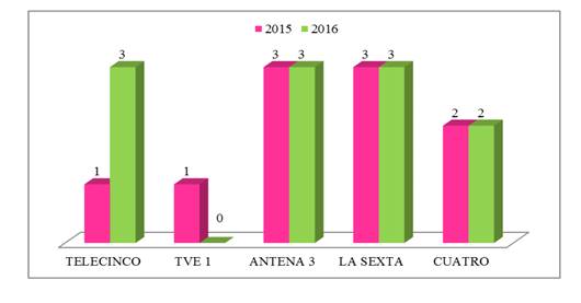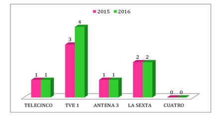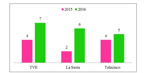 Durante 2015 se emitieron un total de 10 entrevistas, de las cuales 4 se realizaron en TVE, 4 en Telecinco y 2 en La Sexta. Tan sólo seis meses después, durante la campaña de 2016, el número de entrevistas aumentó a 18, liderando TVE (7), seguido de La Sexta (6) y Telecinco (5) (Ver Figura 4).