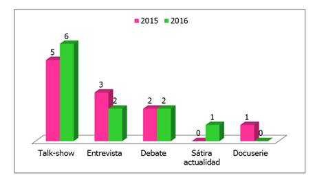 Por tipología de formato, los candidatos presidenciales acudieron a 7 programas informativos durante las campañas electorales de 2015 y 2016. En términos porcentuales, y teniendo en cuenta el total de apariciones televisivas, los programas informativos puros representan el 44% de los programas de la campaña electoral de 2015 y el 37% de los de 2016.