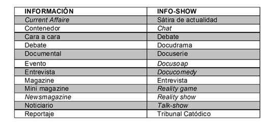 Surge pues el hipergénero informativo, aquel que combina entretenimiento, variedades y ficción, y entre ellos destacan el infoshow y el infoentretenimiento, cuya principal diferencia reside en que en el primero prima el entretenimiento, mientras que en el segundo lo hace la información (Luzón y Ferrer, 2008).