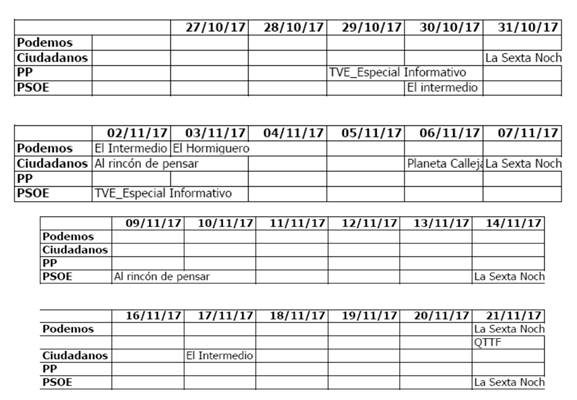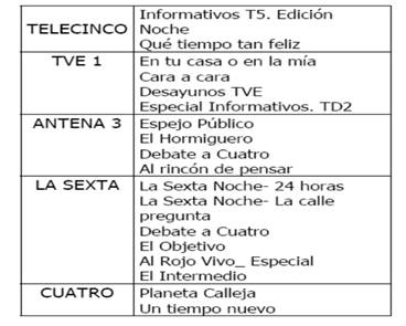 Para un correcto estudio longitudinal hemos escogido los programas en los que los cuatro candidatos a la Presidencia del gobierno y sus primeros espadas han asistido en los periodos comprendidos entre el 27 de octubre y el 18 de diciembre de 2015 y del 3 de mayo al 24 de junio de 2016, es decir, desde el día en que se publica en el BOE y entra en vigor el decreto de disolución de las cortes y se convocan las nuevas elecciones hasta el fin de la campaña electoral. En total hemos analizado hasta un total de 116 intervenciones en programas emitidos en cinco cadenas de índole nacional, una pública (TVE 1) y cuatro privadas (Antena 3, Cuatro, Telecinco y La Sexta).