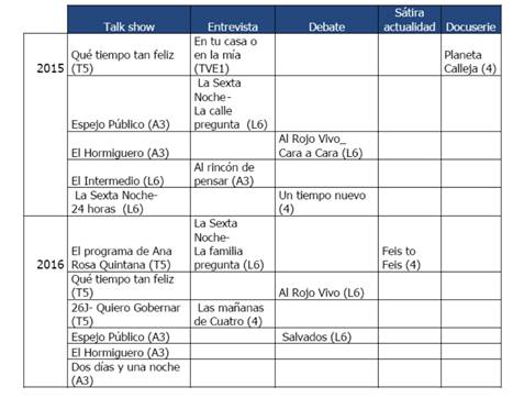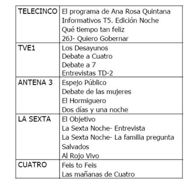 Durante la campaña de 2015 los candidatos asistieron a 17 programas televisivos diferentes, predominando los de La Sexta (6), seguidos de TVE (4), Antena 3 (4), Telecinco (2) y Cuatro (2) (Ver Tabla 3).
