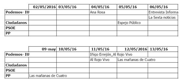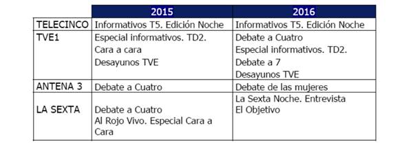 Como puede apreciarse en la Tabla 4, La Sexta vuelve a ser la emisora que más programas dedica a la información política en 2016 (5). En esta ocasión los candidatos acudieron a 19 programas televisivos repartidos por cadenas de la siguiente manera Telecinco (4), TVE (4), Antena 3 (4), Cuatro (2).