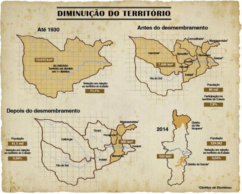 Gradativamente outros recortes aconteceram até que Blumenau estabelecesse seu território atual, com 519,8 km², 19 bairros e dois distritos (Vila Itoupava e Garcia). Desde a década de 1930, vários municípios foram criados configurando o Vale do Itajaí como o conhecemos hoje.