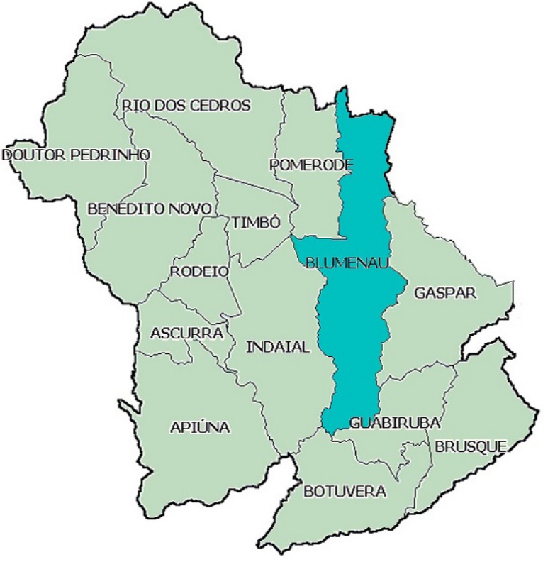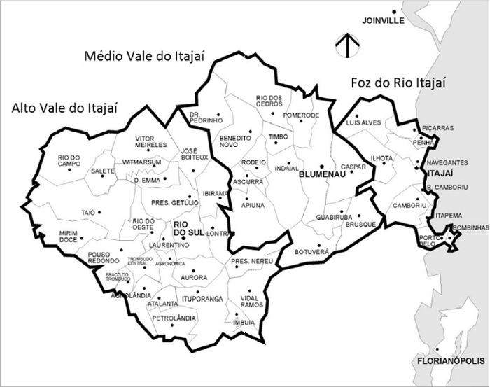 O Vale do Itajaí é uma das seis mesorregiões dentro do estado de Santa Catarina (Oeste, Grande Florianópolis, Norte, Serra e Sul). A região é nominada pelo rio que corta boa parte de seu território, o Itajaí-Açu, que é formado pelos rios Itajaí do Oeste e Itajaí do Sul. No trecho final, já na foz, na cidade de Itajaí, o Itajaí-Açu recebe as águas do afluente Itajaí-Mirim. Localizado numa porção territorial de 13 mil quilômetros quadrados, o Vale é formado por 55 municípios e um total estimado de 1,5 milhão de habitantes. Dentro do Vale do Itajaí são feitas outras subdivisões, sendo que cada uma conta com cidades polo: Alto Vale (município de Rio do Sul), Médio Vale (município de Blumenau) e Litoral (município de Itajaí), conforme Figura 2. Para esta pesquisa, como já mencionamos, foi feito um recorte com foco no Médio Vale.