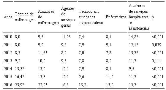 Quando buscou-se relacionar as causas dos afastamentos com os vínculos empregatícios, para de fato tentar estabelecer uma relação entre o adoecimento e o trabalho, encontrou-se associação estatisticamente significativa entre o vínculo empregatício e os capítulos da CID-10 (p<0,001), sendo que o capítulo V foi mais frequente nos técnicos em atividades administrativas, o capítulo XIII foi mais frequente nos auxiliares de enfermagem e agentes de serviços gerais e o capítulo XXI foi mais frequente nos técnicos de enfermagem e enfermeiros, conforme segue na Tabela 1.