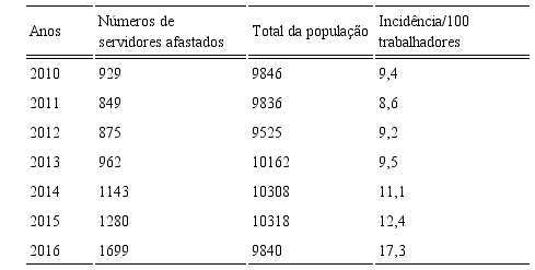 A população de estudo foi constituída de servidores públicos estaduais do poder executivo de Santa Catarina, lotados na Secretaria do Estado da Saúde e afastados por licença para tratamento de saúde, no período de janeiro de 2010 a dezembro de 2016. Foram trabalhados os dados com os servidores lotados na Secretaria Estadual da Saúde, efetivos, estatutários e com regime previdenciário próprio. O denominador foi calculado a partir da informação de total de servidores em todo mês de julho de cada ano.