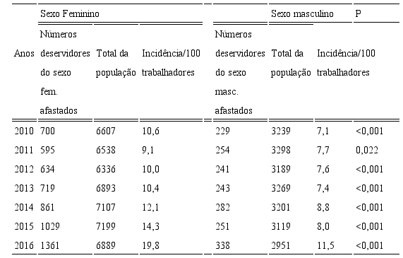 As mulheres apresentam uma incidência significativamente maior de afastamentos quando comparados aos homens em todos os anos. Também é possível observar um aumento da incidência de afastamento em ambos os sexos em 2016, conforme segue na Tabela 4.