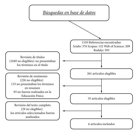 Como fuentes de información para la búsqueda de artículos, se recurrió a las siguientes bases de datos electrónicas: "Scielo", "Scopus", "Web of Science,” "Redalyc" y Google académico. Utilizando los siguientes descriptores (en Portugués/Inglés/Español): "Curricular", Educación Física, "Iberoamérica” y con los criterios de inclusión siguientes, artículos de investigación teórica y/o empírica con resumen y textos completos disponibles para el análisis, entre los años 2013 y 2018. Eliminando los archivos duplicados, logrando un total de 1310, de los cuales 1049 fueron no elegibles por términos del título, 226 por términos de resumen, 29 no elegibles por revisión de texto completo, quedando solo 6 estudios que cumplieron con los criterios inclusión establecidos, de los que se rescató el título, resumen, resultados y discusión para su análisis final.