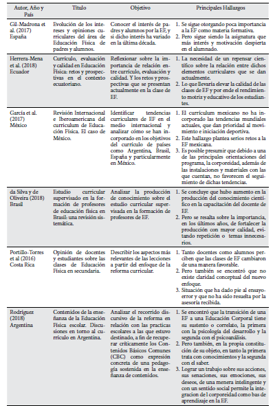 Como se puede apreciar los estudios por países, los cuales nos hablan sobre los currículos actuales de la EF en Iberoamérica, así como de los problemas curriculares tanto en la educación básica, primaria y secundaria, de países como: Brasil, España, México, Ecuador, Costa Rica y Argentina, las cuales están muy relacionados. Además de que los currículos están diseñados en términos de competencias, se puede observar que en los objetivos curriculares de algunos de dichos países se manifiestan los enfoques del currículo como los de corporeidad. Que a continuación se muestran puntualmente caso por caso a partir de los resultados obtenidos (Tabla 1).