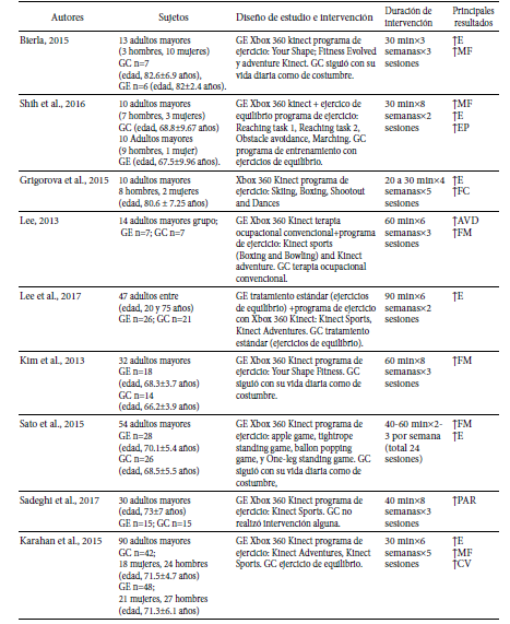 Entre los principales resultados de las intervenciones con Xbox Kinect se observó en el estudio de Karahan et al., (2015) un aumento en la escala de balance Berg pre intervención (49.85± 3.88) post intervención (54.91 ± 2.67) siendo estas diferencias estadísticamente significativas p<0.05 también en los parámetros de calidad de vida, función social, percepción general de salud post-ejercicio en el grupo se observaron mejoras estadísticamente significativas p˂0.05. La evaluación post-ejercicio de la motivación de participación en el ejercicio del grupo de ejercicio de equilibrio doméstico con una escala Likert de 5 puntos reveló que el 7.1% (n = 3) de los participantes evaluó el estudio como "no placentero en absoluto", el 16.6% (n = 7) lo calificó como "desagradable", 42.8% (n = 18) lo calificó como "moderadamente agradable ", 21.4% (n = 9) lo calificó como "bastante agradable", y 11.9% (n = 5) lo calificó como "muy agradable". En el Grupo Xbox Kinect, l 18.7% (n = 9) de los participantes evaluó el estudio como "moderadamente placentero", 37.5% (n = 18) lo consideró "bastante placentero", y 43.7% (n = 21) lo consideró "muy agradable". En el estudio de (Sadeghi et al., 2017) se observa una mejora en la propiocepción de rodilla en la pierna dominante en un ángulo de 30° pre intervención (6.0 ±1.1) post intervención (3.5±1.1) en la pierna no dominante pre intervención (6±1.1) post intervención (3.8±0.8) en 45° pierna dominante pre intervención (5.1±1.6) post intervención (3.1±0.9) pierna no dominante pre intervención (5.9±1.6) post intervención (3.1±0.9) en 60° pierna dominante pre intervención (7.2±1.5) post intervención (3.0±0.6) pierna no dominante pre intervención (7.9±1.4) y post intervención (3.9±1.2) siendo estas diferencias estadísticamente significativas p<0,01. Mientras que en el estudio de Bieryla (2015) se observaron mejoras estadísticamente significativas en la escala de balance Berg y la escala de balance avanzada de Fullerton (p<0.05). En el estudio de Shih, Wang, Cheng y Yang, (2016) se observó un aumento en la escala de balance Berg pre intervención (50.9 ± 5.32) post intervención (53.2 ± 2.86) en el control direccional pre intervención (75.7 ± 8.78) post intervención (78.9 ± 7.65) y disminución en la prueba Timed up and Go pre intervención (9.5 ± 2.45) post intervención (8.71 ± 1.8) siendo estas diferencias estadísticamente significativas p<0,05 en adultos mayores con párkinson. En el estudio de Grigorova, et al., 2015 se observó una disminución en el tiempo de ejecución en la prueba Timed up and Go pre intervención (19.1 ±1.2) post intervención (17.8 ±1.2), un aumento en la escala de balance Berg pre intervención (35.2± 1.9), post intervención (46.8 ±2.6) y un aumento en el test Mini-Mental State Examination pre intervención (18.4±5.4) post intervención (22.9±3.4) siendo estas diferencias estadísticamente significativas p<0,05. Lee en el 2013 mostró un aumento en la fuerza muscular en flexión de hombro pre intervención (4.14 ±1.95) post intervención (5.57 ±2.70) extensión de hombro pre intervención (3.85±2.04) post intervención (5.57±2.37) extensión de codo pre intervención (3.43±2.23) post intervención (5.71±2.93) flexión de codo pre intervención (3.86±2.27) post intervención (6.29±2.81) y en FIM (medida de independencia funcional) pre intervención (62.71±11.48) post intervención (71.42±15.00) en pacientes con accidente cerebro vascular crónico. En el estudio de Lee et al., 2017 se observó un aumento en la escala de balance Berg pre intervención (43.35±6.23) post intervención (46.19±5.57) y una disminución en el tiempo del test Timed up and Go pre intervención (27.18±14.90) post intervención (24.15±10.87) siendo estas diferencias estadísticamente significativas p<0,05 en pacientes con accidente cerebro vascular. En el estudio de Kim et al., 2013 se observó un aumento en la fuerza de extensión de cadera pre intervención (20.70±5.77) post intervención (32.14±6.84) en la flexión de cadera (22.69±12.04) post intervención (29.48±7.42) aducción de cadera pre intervención (26.51±7.03) post intervención (39.40±8.46) abducción de cadera pre intervención (23.80±7.73) post intervención (33.78±9.41) siendo estas diferencias estadísticamente significativas p<0,05. En el estudio de Sato et al., 2015 se observó un aumento en la prueba de alcance funcional pre intervención (29.36±4.40) post intervención (33.88±3.94) y en la prueba de pararse y sentarse de la silla por 30 segundos pre intervención (17.54±17.50) post intervención (24.04±23.50) siendo estas diferencias estadísticamente significativas.