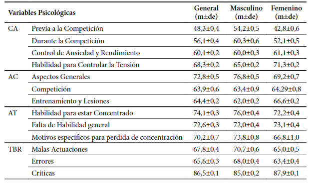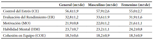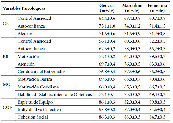 En la Tabla 2 se presentan los valores de puntuación centil (PC) en cada componente de las variables psicológicas globales; CE - Control del Estrés; ER - Evaluación del Rendimiento; MO – Motivación; COE - Cohesión de Equipo. Los principales resultados identificaron valores más altos de (PC) para los factores de CE-autoconfianza (73.1), ER-conducta del entrenador (76.8), MO- habilidad establecimiento de objetivos (72.1) y COE- Cohesión Social (86.3).