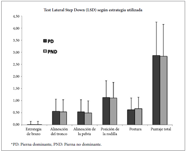 Los resultados en el test LSD muestran que la calidad de movimiento durante un ejercicio de reducción lateral en un cajón de 20 centímetros es moderada (puntaje: 2,9±1,4 para la pierna dominante y 2,8±1,3 para la pierna no dominante), siendo importante la consistencia del valgo de rodilla acentuado durante la ejecución del test. Estos resultados tampoco muestran diferencias significativas entre los grupos etarios o pierna evaluada, Una mala calidad de movimiento se ha encontrado en sujetos luego de la reconstrucción de ligamento cruzado anterior, inestabilidad crónica de tobillo, dolor femoropatelar, y otro tipo de lesiones de extremidad inferior. Luego de una reconstrucción de ligamento cruzado anterior una calidad moderada de movimiento se asoció a un aumento en la aducción de cadera y rotación interna de cadera, lo que podría sugerir que es necesario un fortalecimiento de la musculatura abductora y rotadora de cadera, así como también de la musculatura extensora de rodilla para mejorar el control neuromuscular (Mostaed et al., 2018). Similares resultados se encontraron al evaluar sujetos con dolor patelofemoral, mostrando que aquellas que presentaban mala calidad del movimiento poseían un menor rango de movimiento en la dorsiflexión de tobillo y la debilidad en la musculatura de la cadera parece explicar el déficit en el control de movimiento en aquellos que tenían un buen rango de dorsiflexión de tobillo (Rabin, Kozol, & Finestone, 2014), del mismo modo sujetos con inestabilidad crónica de tobillo, han mostrado tener una menor dorsiflexión de tobillo siendo relacionada a una mala calidad de movimiento en el LSD (Grindstaff, Dolan, & Morton, 2017).