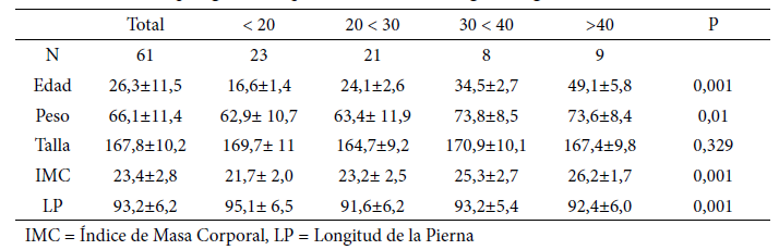 Se evaluaron un total de 61 personas con una edad promedio de 31±22 años 39 hombres (63,9%) y 22 mujeres (36,1%). Las características biotipológicas de la población incluida muestran diferencias significativas entre los grupos etarios para longitud de pierna, IMC, peso y edad (p<0,01). (Ver Tabla 1).