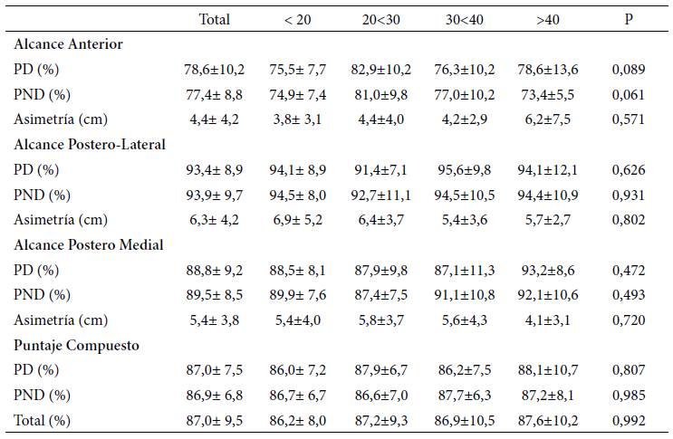 Los resultados encontrados en la evaluación del Y-balance test son presentados en la Tabla 2 en función del alcance total y normalizadas para las direcciones anterior, posterolateral, posteromedial y asimetría para la pierna dominante y no dominante. La comparación entre los grupos etarios no muestra diferencias significativas entre ellos (p>0,05).