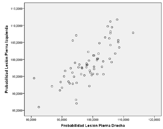 Por otro lado, según el modelo de correlación de Pearson, la probabilidad de lesión en la pierna izquierda y la probabilidad de lesión en pierna derecha tuvo una correlación p< 0,00 r 0,732. Tal y como se observa en el gráfico de dispersión de la Figura 1.
