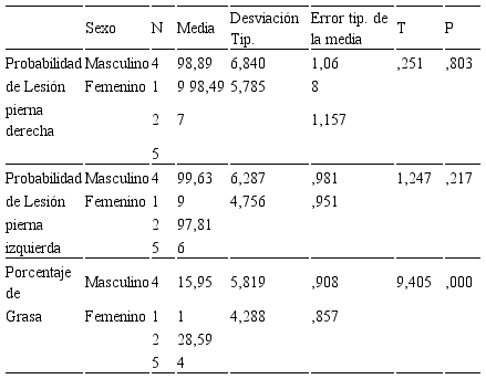 Esta investigación se realizó sobre un total de 66 alumnos universitarios (41 varones y 25 damas) participantes en talleres deportivos como fútbol (16), vóleibol (19), básquetbol (16) y hándbol (15) con una edad media de 21 de años. De la totalidad de la muestra 9 participantes utilizan su pierna izquierda como dominante (hábil), frente a los otros 57 que utilizan su pierna derecha. En la tabla 1 se puede apreciar los resultados en cuanto a probabilidad de lesión de pierna izquierda y derecha, y así también el porcentaje de grasa corporal en damas y varones.