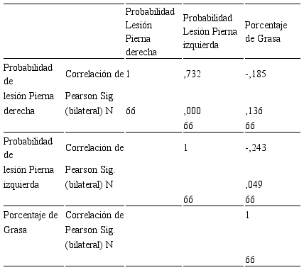 La prueba de correlación de Pearson no indicó relación entre la probabilidad de lesión de la pierna derecha y el porcentaje de grasa corporal de los estudiantes (p>0,05), mientras que la probabilidad de lesión de la pierna izquierda frente al porcentaje de grasa corporal presenta una débil correlación inversamente proporcional, (p=0,049 r= -0,243) lo que indica que, a mayor probabilidad de lesión de la pierna izquierda, existe un menor porcentaje de grasa corporal. Tal y como se demuestra a continuación en la tabla 2.