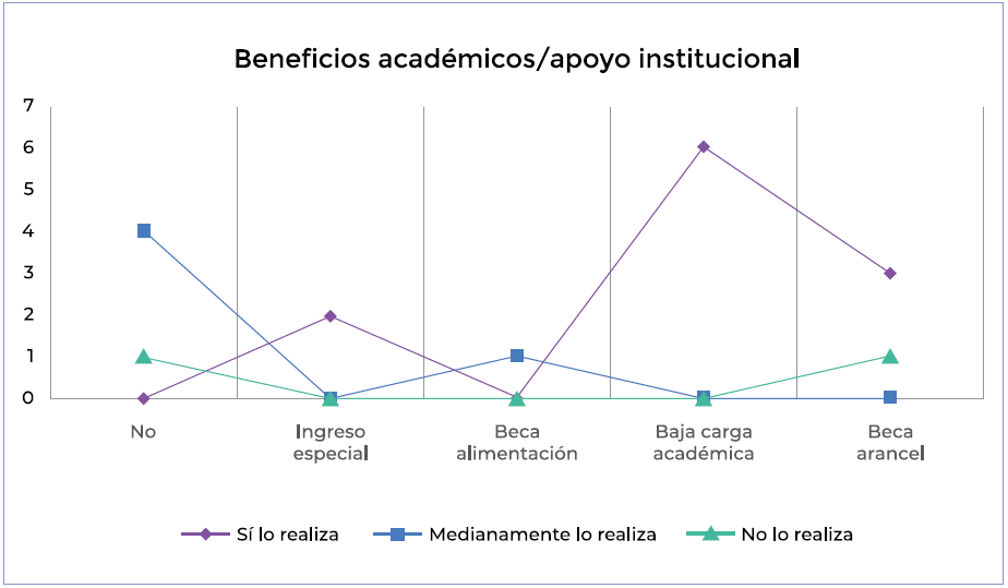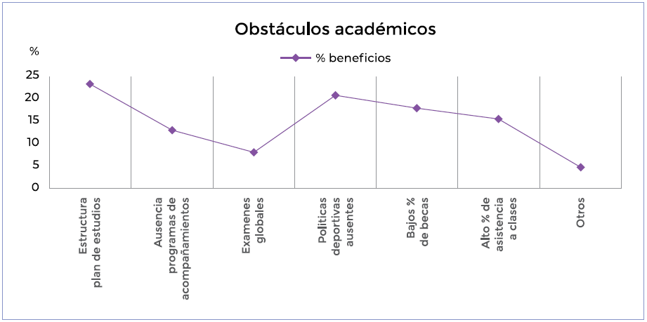 Si bien es cierto, que desde el análisis cuantitativo no hay diferencias significativas entre las medias de todas las variables, destacan como obstáculo más significativo entre los deportistas que estudian en la educación superior, los reglamentos académicos rígidos; los altos porcentajes de exigencias a asistencia a clases, una academia distantes a los deportistas; la ausencia de programas de acompañamientos y políticas educativas excluyentes. Estos resultados, son próximos con los visualizados por Ramírez, Vinaccia & Gustavo (2004), quienes en el rendimiento académico de su población de estudio, el 80 % posee desempeño destacado. Sin embargo, esta revisión de factores obstaculizadores del ámbito académico, evidencian la neutralidad o pasividad con la que las instituciones de educación superior abordan el problema desde los beneficios y apoyos hacia los deportistas (Figura 3), y como consecuencia de éste actuar, se traduce en que 5 sujetos de estudio no poseen beneficios estudiantiles de ningún tipo.