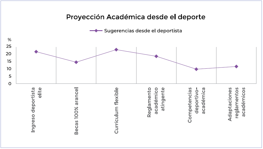 En el ámbito académico, las sugerencias identificadas por los deportistas no manifestaron diferencias significativas entre ellas, pero las más destacadas en el ámbito académico desde la vivencias de los sujetos de estudio es, plantear un currículum flexible e ingreso deportistas elite (Cifuentes, 2014), para así mitigar brechas e iniquidades en acceso a estudios superiores, al igual que mayores ofertas de becas deportivas y cuerpos multidisciplinarios en el ámbito deportivo, que permitan promover y cooperar la realización de ambas actividades de forma exitosa (Figura 4). Esto, se demuestra en el estudio de Jacques et al. (2016), quienes señalan entre los factores macro que inciden en el rendimiento deportivo de un atleta de elite, los cuerpos de profesionales para el apoyo integral de los deportistas. Si bien estas variables no son fáciles de movilizar o sistematizar en el corto plazo, permitirían abrir nuevas puertas y nuevos horizontes para los futuros deportistas estudiantes.