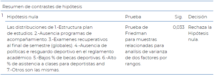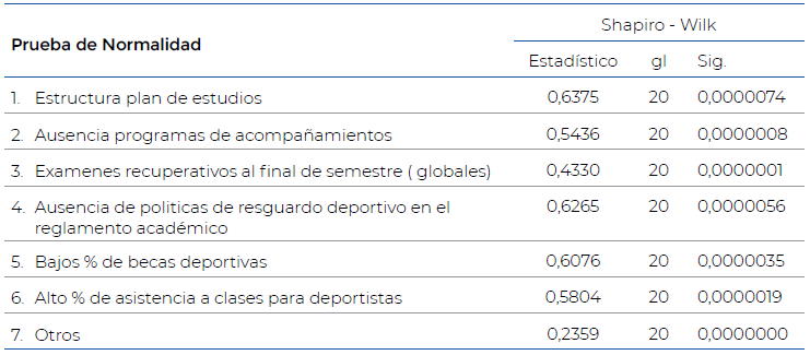 En referencia a la estadística inferencial, para determinar diferencias significativas entre variables que representaban los principales obstáculos para el proceso académico, se evalúa si las variables tenían distribución normal mediante pruebas de Shaphiro – Wilk (Tabla 1). Al observarse, que no había distribución normal, se utilizó la Prueba no paramétrica de Frieddmann (Tabla 2). Para todas las pruebas, se utilizó un nivel de significancia del 0.05. Los análisis fueron llevados a cabo mediante programa estadístico SPSS, versión 25. Una vez aplicada la prueba de Friedmann, los resultados fueron los siguientes: