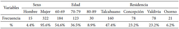 En la Tabla 1 se observa la descripción de la muestra, en donde un 95.6% es mujer versus un 4.4% de varones. Respecto de la edad podemos ver que el mayor porcentaje se encuentra entre los 60-69 años, con un 54.6%, un 36.5% está entre los 70-79 años y solo un 8.9% se encuentra entre los 80-89 años. Respecto al lugar de residencia un 47.4% pertenece a la cuidad de Talcahuano, un 23.2% se encuentra en Concepción y Valdivia, y un 6.2% reside en Osorno.