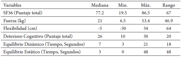 La Tabla 2, expone la mediana de cada uno de los test aplicados, además de presentar los resultados mínimos, máximos y rango asociada para cada prueba. En cuanto a la fuerza, se observa una mediana de 21 kg (Rango: 46.9), presentando un valor mínimo de 6.5 y un máximo de 53.4 kg. En cuanto a la flexibilidad, se presenta una mediana de -5 con un valor mínimo de -30 y un máximo de 34. El deterioro cognitivo presentó una mediana de 26 puntos (Rango: 20) con un valor mínimo de 10 y máximo de 30. En cuanto al equilibrio, se observa que la mediana para equilibrio dinámico fue de 7 segundos (Rango: 18) con un mínimo de 3 y un máximo de 21, y para el equilibrio estático una mediana de 3 segundos (Rango: 48)con un mínimo de 0 y un máximo 48. Ahora bien, para la tabulación de los datos del test SF-36, en el presente estudio, los adultos mayores presentan una mediana de 77.2 puntos, lo que se presenta como una óptima calidad de vida.
