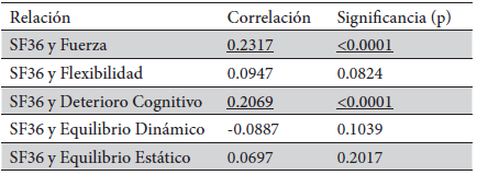 La Tabla 3, presenta las correlaciones entre SF36 y las diferentes variables evaluadas, en el cual podemos indicar que la correlación entre SF36 y fuerza es significativa y positiva, aunque es muy baja, al igual que la correlación entre SF-36 y deterioro cognitivo, por tanto las relaciones evaluadas no se explican al azar y sí existe un factor de asociación entre ellas, pese a que la relación es muy baja. La variable de flexibilidad sólo presenta una leve tendencia a la significancia. En cuanto a las variables de equilibrio estático y dinámico no presentan significancia al asociarla con el test SF36.