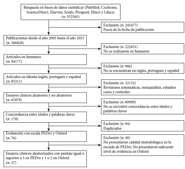 Criterios de exclusión: Revisiones sistemáticas, metaanálisis, estudios casos y controles. Artículos duplicados y que no exista relación entre título y palabras claves. Artículos que no presentaron calidad metodológica en la escala de PEDro; y que no presentaban suficiente nivel de evidencia en Oxford.