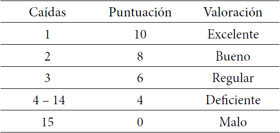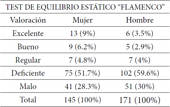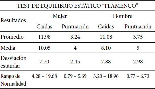 La Tabla 9 describe el análisis de medidas de tendencia central y variabilidad por la cantidad de mujeres y hombres evaluados(as), determinando las caídas en la realización del test y puntuación del test de equilibrio estático separados por sexo.