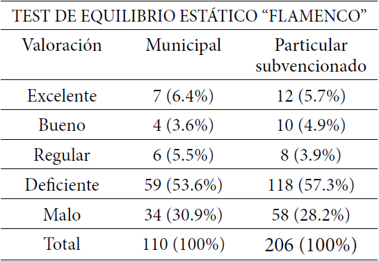 Existen diferencias en el nivel de equilibrio estático en alumnos de 1º y 2º básico por tipo de Establecimiento Educacional, se aprecia al realizar la sumatoria de las categorías (excelente, bueno y regular), en donde los niños establecimientos municipales presentan a un 15.5%, en cambio los particulares subvencionados presenta un 14.5%. Por otra parte al realizar la sumatoria de las dos categorías restantes (deficiente y malo) se aprecia que los niños de establecimientos municipales presentan a un 84.5%, en cambio los particulares subvencionados presentan un 85.5% de ellos.