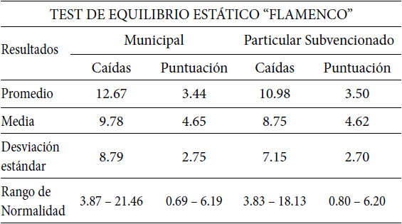Se describen los resultados obtenidos por los niños de cada establecimiento educacional. Se distribuye en tres grupos, en primera instancia la cantidad de alumnos (as) evaluados (as) divididos por edad, luego los resultados de la aplicación del test de equilibrio estático, y finalmente en tercera instancia los resultados de la aplicación del test de equilibrio dinámico. En aquellos grupos a su vez se sub dividió en dos grupos en que el primero será por sexo, y luego por tipo de establecimiento. Además se realizó primero el análisis descriptivo de frecuencia nominal y ordinal, y luego el promedio, media, desviación estándar y rango de normalidad que representa el análisis descriptivo de tendencia central y variabilidad.