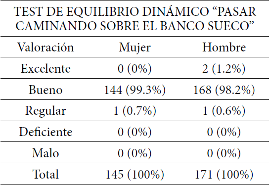 La Tabla 12 determina la cantidad de mujeres y hombres separados por valoración del test de equilibrio dinámico, el cual establece 5 categorías como excelente, bueno, regular, deficiente y malo. Se aprecia que los mas altos % (porcentajes) se encuentran en la valoración bueno.