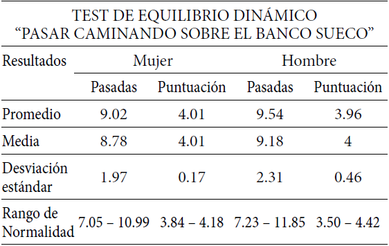 La Tabla 13 describe el análisis de medidas de tendencia central y variabilidad por la cantidad de mujeres y hombres evaluados (as), determinando las pasadas en la realización del test y puntuación del test de equilibrio dinámico Separados por sexo.
