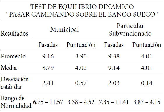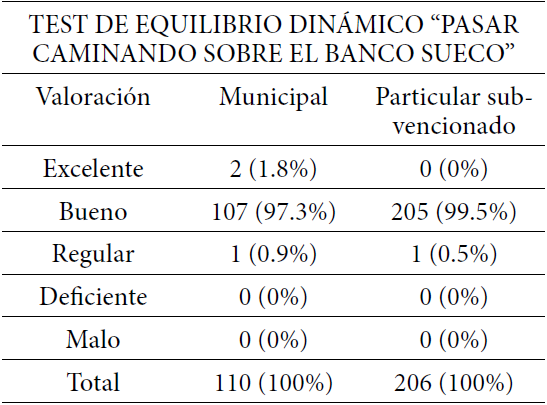 El nivel de equilibrio dinámico en alumnos de 1º y 2º básico por tipo de Establecimiento Educacional, los de establecimiento municipal presentan en el nivel excelente a un 1.8% de sus estudiantes, en cambio los particulares subvencionados no presentan este nivel. Se puede aprecia al realizar la sumatoria de las dos categorías (bueno y regular), que los niños de establecimientos particulares subvencionados presentan un 100%, en cambio los municipales presenta un 98.2%. Por otra parte al realizar la sumatoria de las dos categorías restantes (deficiente y malo) no se presentan a estudiantes de ninguno de los establecimientos. Según Merino y Santibáñez (2001) para que el equilibrio se desarrolle en forma óptima se deben cumplir cuatro factores que van relacionados entre sí, el anatómico – fisiológico, psicomotor, biomecánico y psicológico, si uno de esto falla influirá en el desarrollo de esta capacidad.