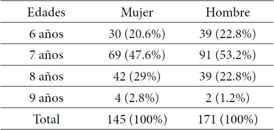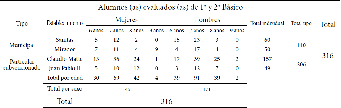 La muestra fue intencionada y correspondió a 316 estudiantes de La Granja de dos de los tres tipos de administración educacional, cuyas edades fluctuaron entre los seis y nueve años de ambos sexos, 145 mujeres (45,9%) y 171 hombres (54,1%). Cada padre firmó el asentimiento informado.