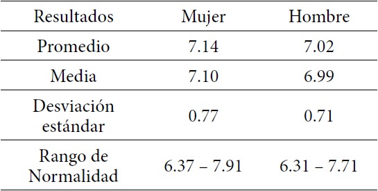 La Tabla 4 describe la cantidad de mujeres y hombres separados por edad de los alumnos (as), utilizando el análisis descriptivo de frecuencia nominal y ordinal, la mayor cantidad de alumnos (as) tiene 7 años y la menor cantidad tiene 9 años. La tabla 5 describe el análisis de medidas de tendencia central y variabilidad de mujeres y hombre.