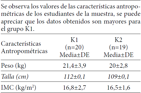 La Tabla 1 muestra las características antropométricas de los evaluados. Las Tablas 2 y 3 describen los subtest de habilidades locomotrices y control de objetos que administra el test Tgmd-2. La Tabla 4 muestra los resultados finales para el desarrollo motor grueso en general. La Tabla 5 muestra el porcentaje de niños en cada una de las clasificaciones del estado nutricional.