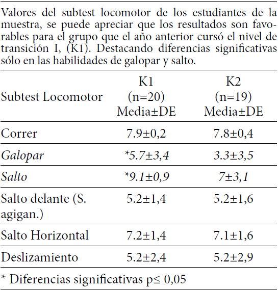 Los resultados obtenidos en este estudio no fueron estadísticamente significativas, en cuanto al desarrollo motor grueso, existen diferencias a favor del grupo con presencia de transición I en las pruebas de subtest locomotor y de control de objetos destacando las habilidades de galopar, salto, batear una bola estacionaria, drible estacionario y tomar, las cuales no alcanzan a ser estadísticamente significativas en el coeficiente motor total entre ambos grupos.