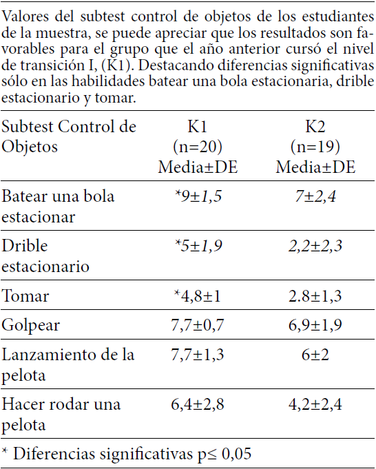 Al comparar ambos grupos evaluados, se advierte que las diferencias existentes están siempre a favor del grupo que curso el nivel transición I, no siendo significativas. Similar situación ocurre en otras investigaciones que trabajaron comparando grupos. Rodríguez et al. (2013) trabajo con dos grupos con un promedio de edad de 4,5 años, uno que era estimulado por medio de un profesor especialista del área de la Educación Física y otro por el profesor responsable del grupo, al término de un periodo determinado se encontraron diferencias no significativas, a favor del grupo que trabajo con el especialista del área. Situación similar a lo encontrado por Alves et al., (2014), quien trabajo con niños con edades entre los 7 y 9 años, dividiéndolos en dos grupos, uno que era con mayor estimulación motriz que el otro, encontrando diferencias no significativas a favor del grupo con mayor estimulación. Todo esto datos respaldan lo que plantea Stodden et al., (2008), al decir que la inserción de programas de estimulación motriz genera logros motores en la educación de los niños(as), lo que García Núñez y Berruezo (1999) complementan diciendo que la educación motriz en preescolares posibilita la maduración al control del cuerpo, desde el mantenimiento de la postura, movimientos amplios, locomotrices y movimientos que requieran mayor exactitud, favoreciendo el proceso del cuerpo y de las coordenadas espacio-temporales en los que se desarrolla la acción.