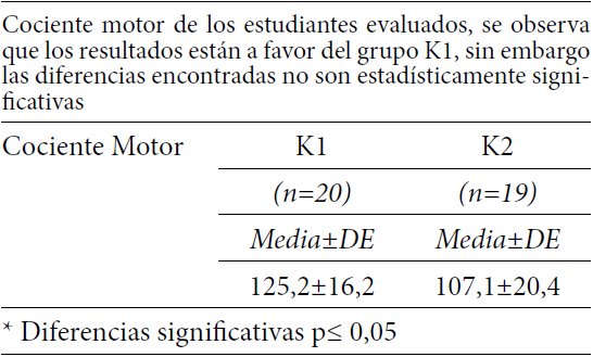 Al comparar los datos obtenidos por cada habilidad evaluada son similares a lo encontrado por Jornada et al., (2011) y Coelho et al., (2014) quienes trabajaron con niños de similar edad de distintos estados de Brasil. Al comparar los datos de coeficiente motor, se aprecia que los encontrados en este estudio son mejores a los reportados por Oliveira et al., (2011) y Stock et al., (2012) quienes trabajaron con niños de Portugal y Brasil respectivamente, teniendo ambos grupos edades similares. Situación que puede estar ocurriendo debido a la mayor estimulación motriz que presentan los niños con presencia de transición I, ya que tuvieron una enseñanza de los contenidos específicos en la pre básica, siendo los saberes corporales, lúdico y motores. Por lo que obtuvieron mejores resultados gracias a estas estimulaciones, desarrollando sus capacidades corporales y motoras a edades tempranas. Como plantea la OMS (2009), la estimulación motriz en los primeros años de vida (periodo prenatal hasta los ocho años) es relevante para su desarrollo a nivel mental, emocional y físico.