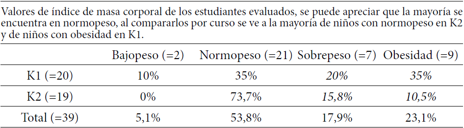 El estado nutricional se calculó por medio del índice de masa corporal (IMC), de acuerdo a los criterios establecidos por el ministerio de salud de Chile (2014). El peso se calculó con balanza digital (scale-tronix, USA) y la estatura con estadiómetro (Seca, modelo 220, Alemania).