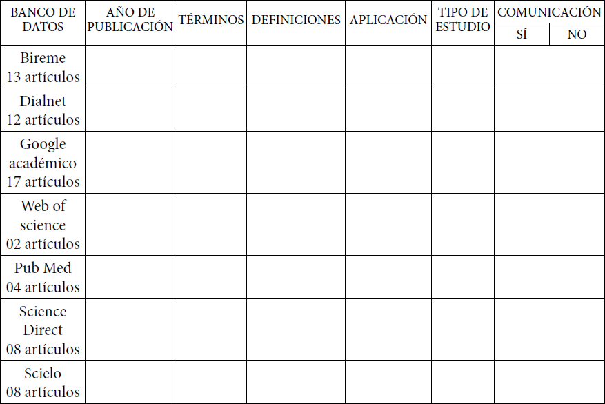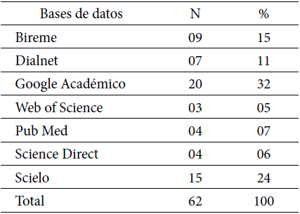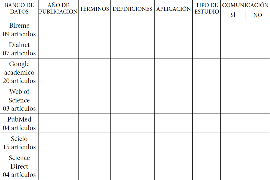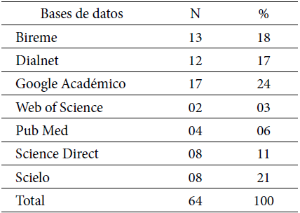En bases de datos Bireme, Science Direct y Scielo mencionaron 7 (16%) cada uno; en la base de datos de Dialnet informaron seis términos (14%); Google Académico fueron citados 10 (23%), Web of Science mencionado en 2 (4%) y 5 Pub Med dichos términos (11%) como se muestra en la Tabla 4.