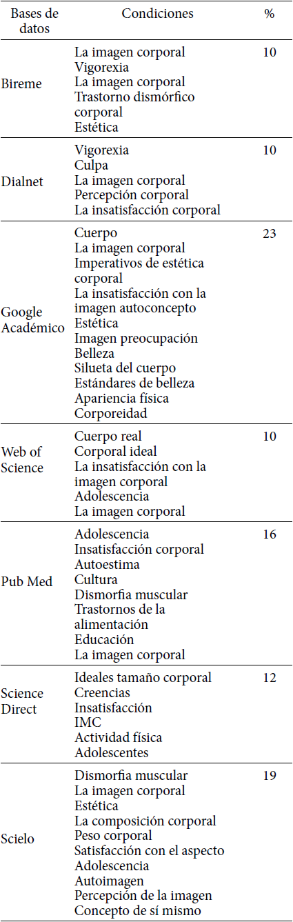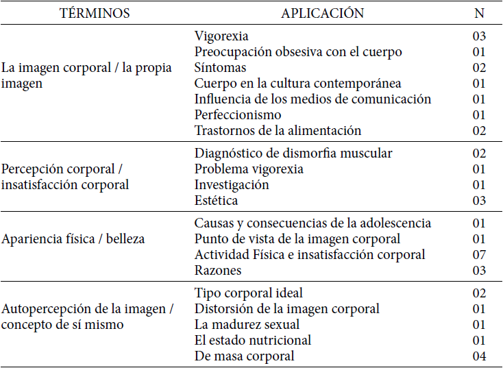 La Tabla 3 muestra los términos encontrados en siete bases de datos, relacionadas con la imagen corporal, en el que se cita: vigorexia, la imagen corporal, el cuerpo Trastorno Dismorfóbico, Estética, la culpa, la percepción del cuerpo, insatisfacción corporal, cuerpo, cuerpo imperativos estéticos, la insatisfacción de la propia imagen de la imagen, la preocupación con la imagen, la belleza, la silueta del cuerpo, los estándares de belleza, apariencia física, realización, dismorfia muscular, la composición corporal, el peso corporal y la satisfacción con la apariencia. Los términos que se utilizan con mayor frecuencia fueron: la imagen corporal, cuerpo insatisfecho con la imagen y el menos usado como término fue: la culpa.