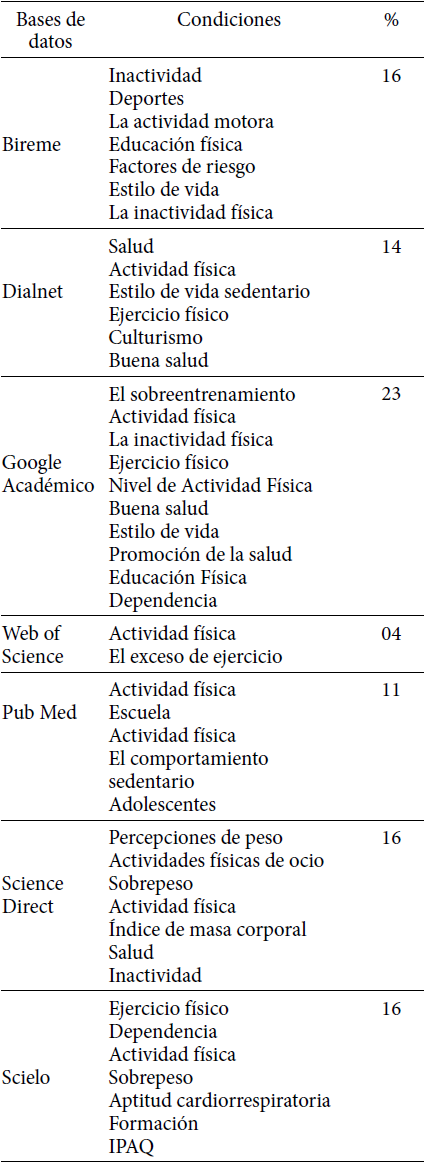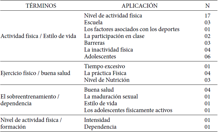 La Tabla 4 destaca términos en las bases de datos relacionadas con el nivel de actividad física, siendo citados: 'Sueño, Deporte, Actividad Física, Educación Física, Factores de riesgo, estilo de vida, la inactividad física, la salud, la actividad física, sedentarismo, el ejercicio, el culturismo, aptitud física, formación exceso, nivel de actividad física, aptitud física, promoción de la salud, la adicción, el sobrepeso, la aptitud cardiorrespiratoria, la formación e IPAQ. Los términos más mencionados fueron: actividad física y ejercicio y el menor fue: Deportes.