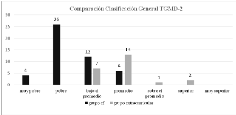 Al analizar los resultados en la clasificación general del TGMD-2, se observa que el 89% de los escolares del GEF obtienen puntajes que los ubican en rangos menores de desarrollo motor de acuerdo a su edad cronológica, lo que coincide con los resultados obtenidos por otras investigaciones en Chile de similares características, que además utilizaron el mismo test, Gatica y Vargas (2004 y 2006), Luarte y cols. (2014), Luarte, Poblete y Flores (2014), Poblete, Flores y Bustos (2013), Poblete, Morilla y Quintana (2015), Luna y cols. (2016), lo que deja en evidencia, por los datos obtenidos en dichos estudios y en el presente, que la estimulación que están recibiendo los escolares pareciera ser insuficiente a los requerimientos de su dimensión motriz.