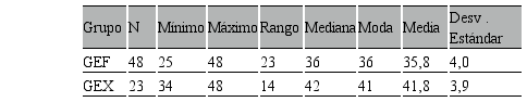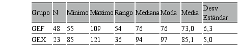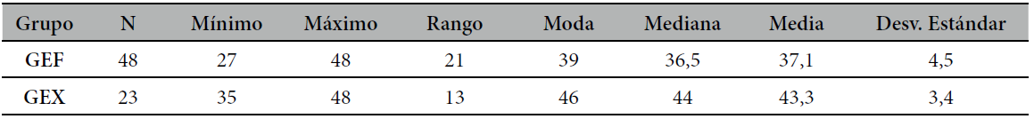 Tabla 1. Permite apreciar mejores resultados en el GEX respecto al GEF, la media, moda, mediana y el puntaje mínimo son mayores, por su parte tanto el rango como la desviación estándar son menores en el GEX. De esta forma el GEX se presenta como un grupo más homogéneo y de mejores resultados que el GEF.