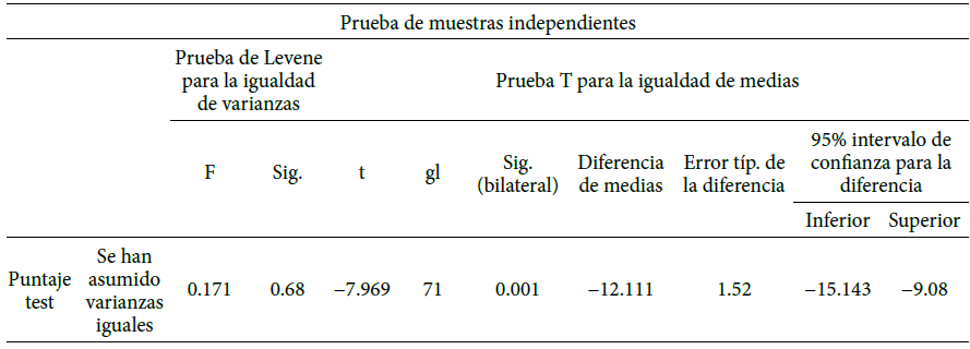 Tabla 4. Al realizar la prueba T-Student en la diferencia de puntación entre los resultados obtenidos en el TGMD-2 del GEF y GEX, se observa un valor p<0.05, por lo tanto, los promedios de los puntajes son diferentes entre ambos grupos, confirmando que sí existen diferencias significativas en los resultados obtenidos en las evaluaciones realizadas.