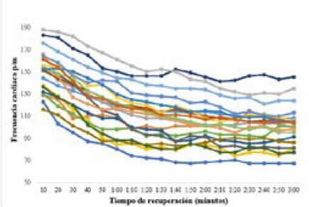 Al revisar la Figura 1 se observa que después de finalizar el test la FCr disminuye de manera rápida y notoria hasta el primer minuto de recuperación en la mayoría de los sujetos. Desde el primer minuto hasta finalizar el tiempo de recuperación de tres minutos, la FCr de los sujetos en general se va manteniendo relativamente constante.