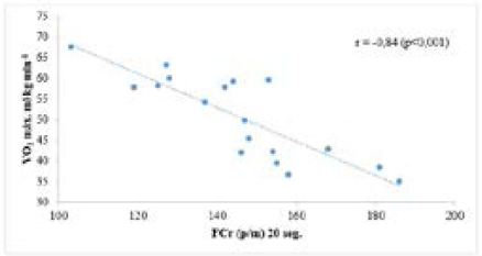 En la Figura 2 se aprecia la correlación existente entre la FCr y el VO2 máx. Dicha correlación es negativa, ya que mientras una de las variables aumenta la otra disminuye, y a la inversa.