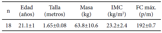 La Tabla 1 muestra la cantidad total de sujetos que realizaron los test físicos y se puede observar el promedio de cada dato registrado además de su desviación estándar correspondiente. Además se realizó un cálculo de IMC, donde se aprecia que los sujetos se encuentran en un estado normal. También se les calculó la FC máxima teórica con la fórmula 207 – 0.7 * edad (Tanaka, Monahan, & R. Seals, 2001).